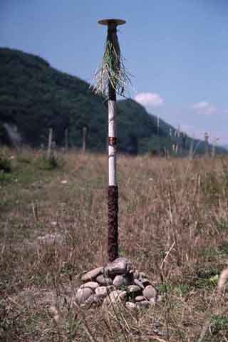 Thinking that somewhere in the foothills of the Alps, I might be able to find an out of the way place, we left Lyon for Annecy, taking small back-roads through even smaller villages. Driving in France is difficult because road names and numbers are less important than the towns that the roads lead to. And many of these towns have similar names, the difference being some French suffix or prefix, the meaning of which was lost on me. Nonetheless, near the town of Yenne, along a river with a beautiful mountainous backdrop, I found the perfect place. Had to drive off-road, and avoid the couple of guys who were fishing. They looked just as guilty as me, and left shortly after seeing me. I found a spot somewhat hidden, and began digging. It was very hot and much stonier than I was prepared for. Needless to say, it was knuckle-bruisingly difficult and took longer than expected.