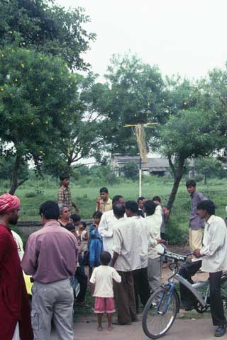 As we were driving close to the site, we were waived down by a group of maybe 20 people including the papers, tv, and local politicians and activists. So in conversation (most of which I couldn’t follow, not speaking a word of Hindi), the decision was then made to put the post in a convenient gap in the sidewalk just in front of the plant. There was a flurry of mad activity: a local man gives me a poem he has written on the tragedy, somehow the hole gets dug to the correct depth, my picture is taken dozens of times (in every photo, somehow, the local politico manages to be standing next to me), the "crying" device is endlessly videotaped by others, scores of boys show up, scores of others show up, the police arrive in increasingly higher levels of authority, the post is put together, put in the hole, someone mixes concrete, and the post is up and working in say 15 minutes (much more quickly than normal).
